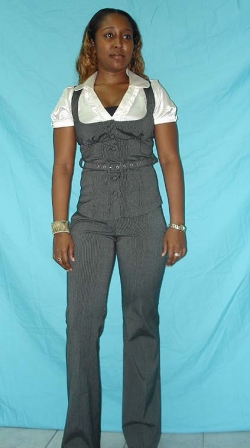 Jacket Style: Fine striped, ruffled v-neck (front line) jacket with slim matching belt above waist. Colour: Black and cream stripes. Sleeves, collar and ruffled v-neck (front line) is plain cream. Material: Polyester/Rayon/Spandex. Plain cream contrast: Polyester/Spandex Pants Style: Fine striped, high waist, buttoned front with broad belt loops. Colour: Black and cream stripes. Material: Polyester/Rayon/Spandex. Model: Sanjay Jacktoo Photo: Amitabh Sharma Outfit courtesy: Kabella's, Shop #6 Premier Plaza, Kingston 10. Tel: 906-7058. |