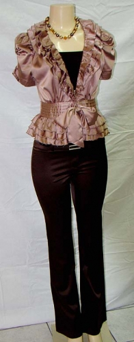 Jacket Style: Ruffled cap sleeve jacket which ties at the front. Jacket has shiny a finish. Colour: Metallic Coffee Material: Polyester/Spandex Care Instructions: Hand Wash Cold Pants Style: Boot leg cut, shiny material pant with a thin belt. Colour: Metallic Chocolate Brown Material: Nylon/Rayon/Spandex Care Instructions: Hand Wash Cold Tube Top Colour: Chocolate Brown Material: Spandex Necklace: Brown and gold pearl necklace set with matching earrings. Photo: Amitabh Sharma Outfit courtesy: Kabella's, Shop #6 Premier Plaza, Kingston 10. Tel: 906-7058 |